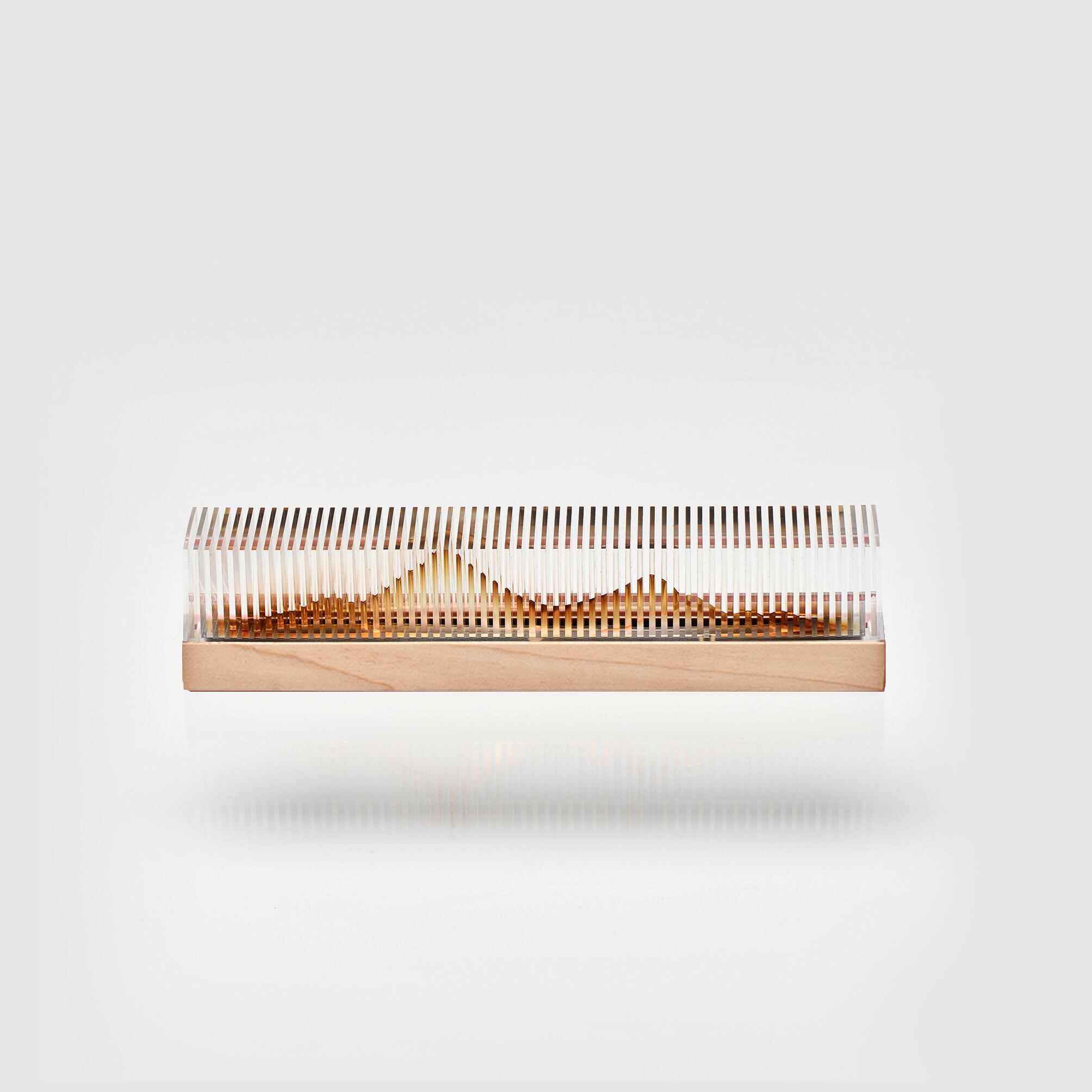 ホルダー上部は、透き通った透明感ある高純度アクリル素材を使用し、1.3mm板を2mm間隔の精度で並べ、内側には彫刻された山脈が施されています。
